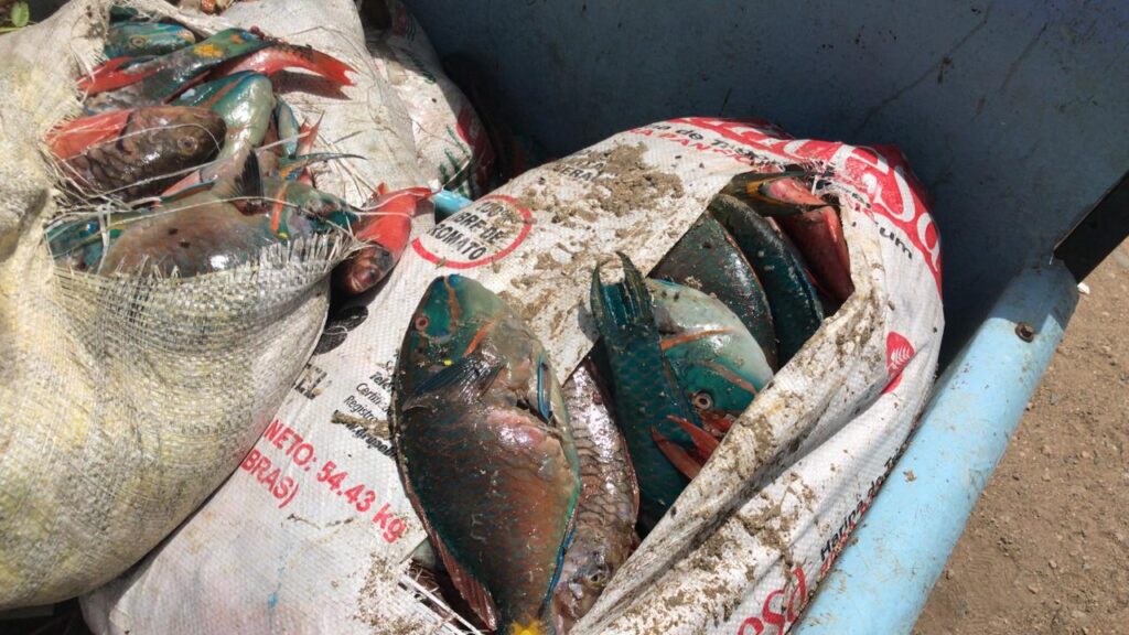 Un un operativo conjunto entre el Consejo Dominicano de Pesca y Acuicultura (CODOPESCA) y el Ministerio de Medio Ambiente, en coordinación con la Armada de la República Dominicana y el Servicio Nacional de Protección Ambiental, se decomisaron 03 sacos conteniendo en su interior peces herbívoros de la familia Scaridae (peces loros), cuya captura está prohibida por disposición del decreto presidencial 418-21.