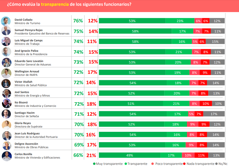 Santo Domingo – El ministro de Turismo, David Collado, es el funcionario con mayor nivel de transparencia de los funcionarios del presente gobierno del presidente Luis Abinader, según los resultados de la reciente encuesta Sondeos en el que se evalúa la eficiencia en la gestión, comunicación con la ciudadanía, transparencia, cumplimiento de responsabilidades, mejora institucional y compromiso con el presidente.