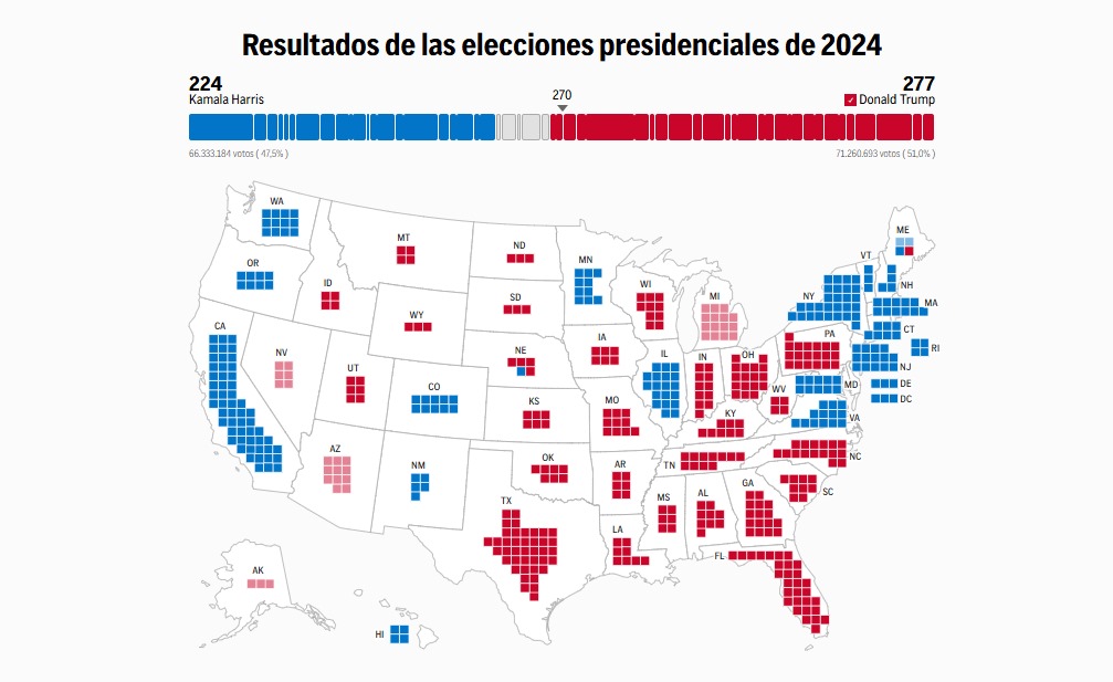 El candidato republicano a la Casa Blanca, Donald Trump, se proclamó este miércoles ganador de las elecciones en Estados Unidos con un total de 277 votos electorales.
