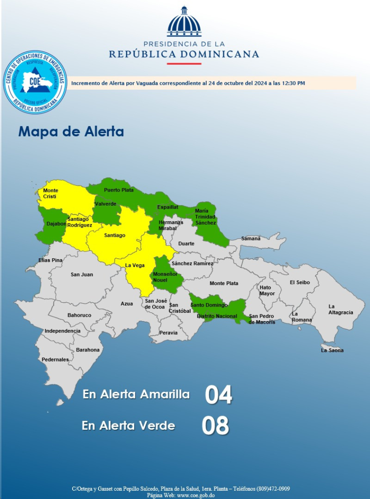 En alerta amarilla están Monte Cristi, Santiago Rodríguez, Santiago y La Vega. Mientras que en alerta verde se encuentran Dajabón, Puerto Plata, Valverde, Espaillat, María Trinidad Sánchez, Monseñor Nouel y el Gran Santo Domingo.