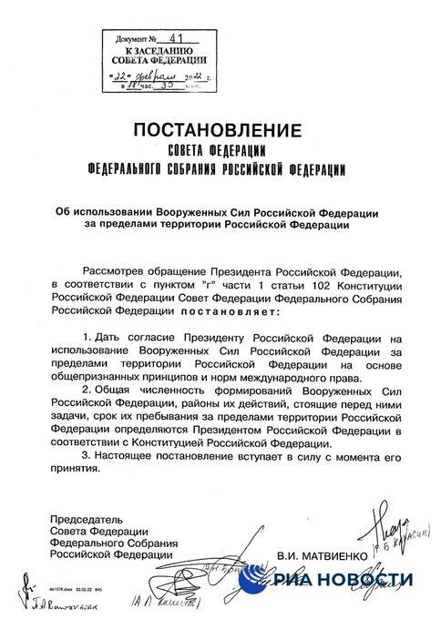 Comentando la votación, la presidenta de la cámara, Valentina Matvienko, indicó que el uso de las tropas rusas tendría como objetivo «establecer la paz en el Donbass, […] detener esta sangrienta guerra civil, evitar más bombardeos de asentamientos pacíficos, civiles, crear condiciones normales para la vida de las personas y garantizar la seguridad».