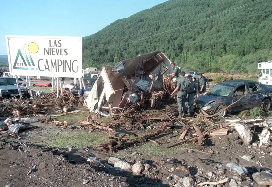 7 agosto 1996.- Ochenta y siete muertos y 200 heridos al quedar sepultadas por una riada de agua, piedras y lodo, tras una tormenta, que arrasó el camping “Virgen de las Nieves”, cerca de Biescas, en el Pirineo oscense.