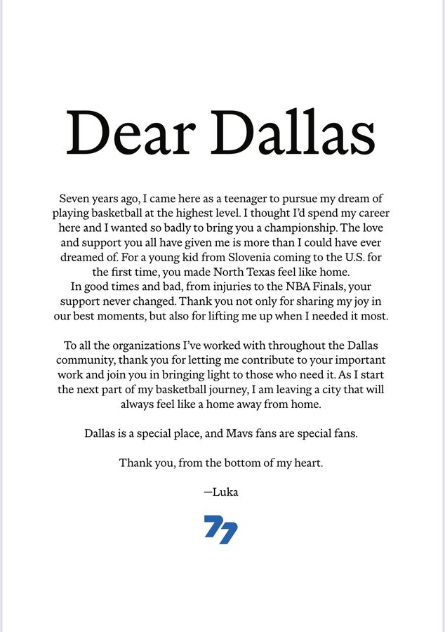 En una carta abierta, Doncic expresó su profundo agradecimiento a la afición y a la ciudad que lo vio crecer profesionalmente desde su llegada a la NBA. “Quería tanto traerles un campeonato”, escribió el base. “Pensé que pasaría toda mi carrera en Dallas. Para un joven de Eslovenia que llega a Estados Unidos por primera vez, hicieron que el norte de Texas se sintiera como casa”.