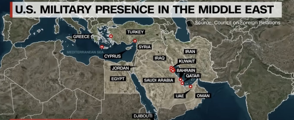 Estados Unidos tiene instalaciones militares y personal en bases en al menos 19 emplazamientos entre Arabia Saudí, Baréin, Egipto, Emiratos Árabes Unidos, Irak, Israel, Jordania, Kuwait, Catar y Siria.