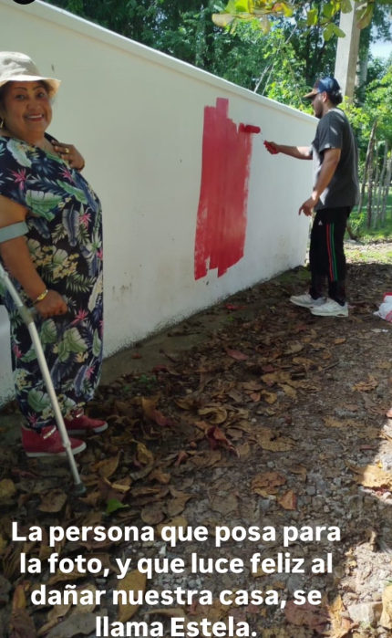«La persona que posa para la foto, y que luce feliz al dañar nuestra casa, se llama Estela«, indicó el artista en la foto mostrada.